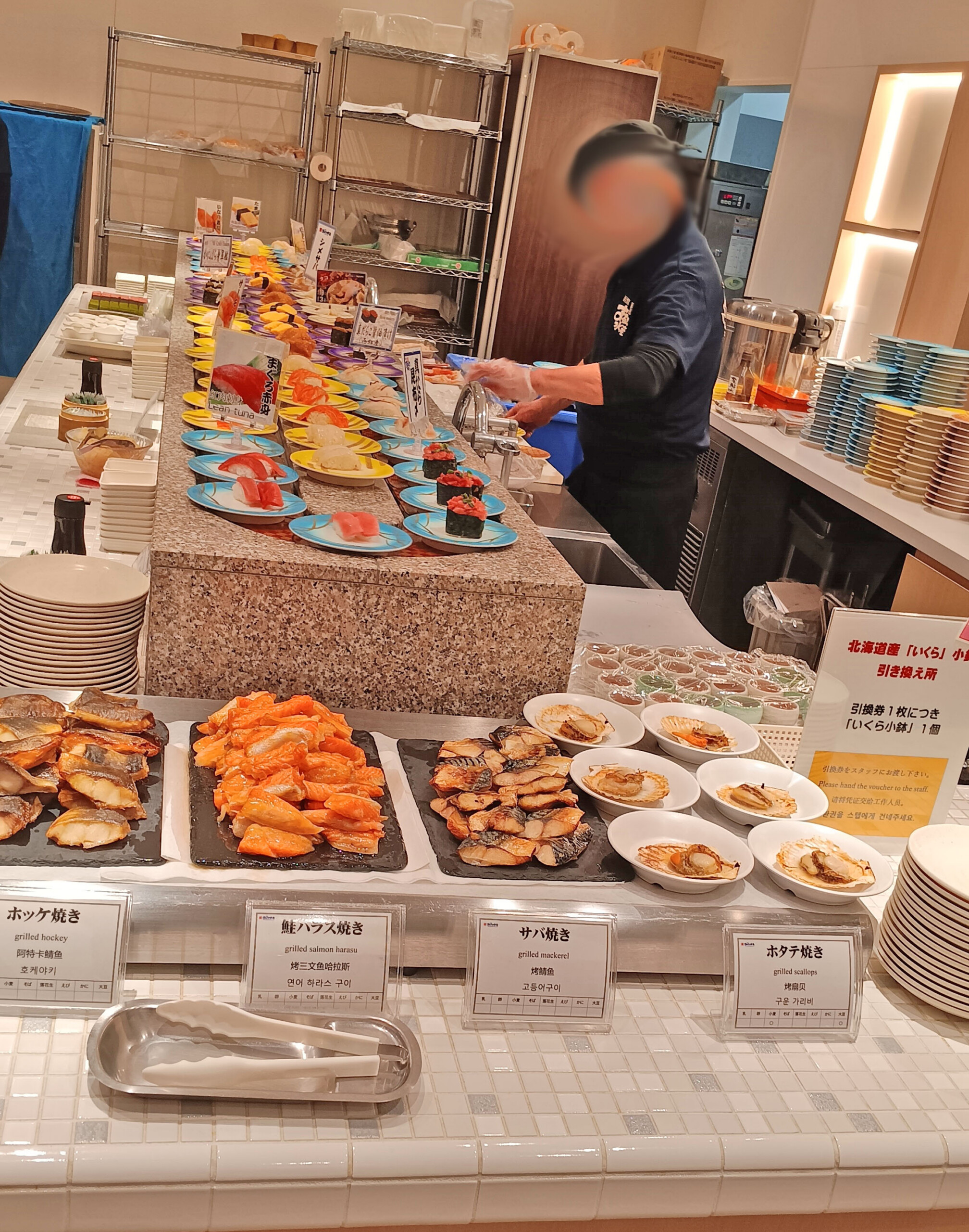 As long as a particular vendor is accepting tickets, you can top your bowl of rice with everything from scallops and salmon roe to mackerel and herring roe: