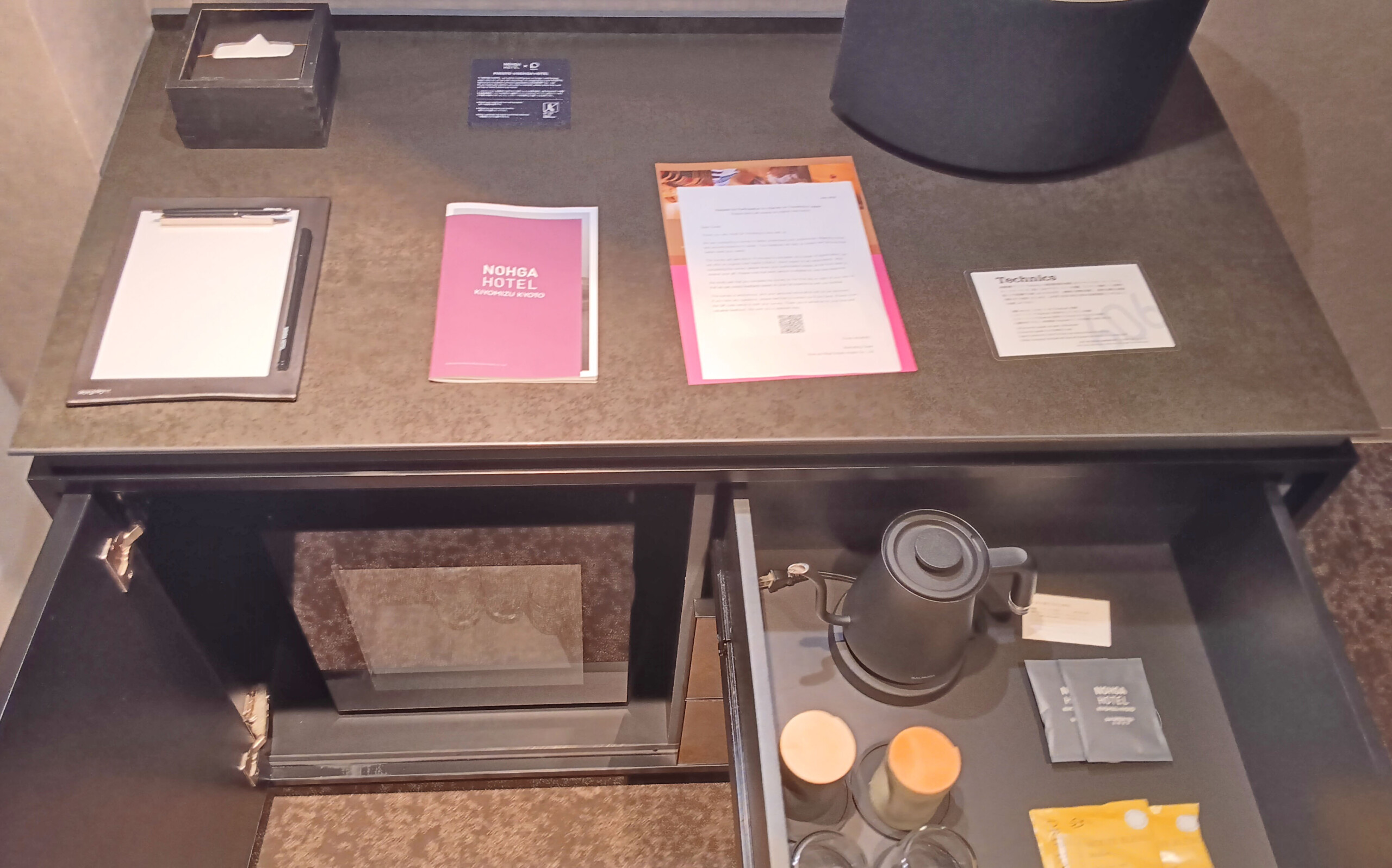 There’s an amenity table right in front of the elevator bank, in case you had forgotten shaving cream, or a few other vanity products. For those looking to get more insight into the Kiyomizu neighborhood, there’s a newsletter with doings-a-transpiring.