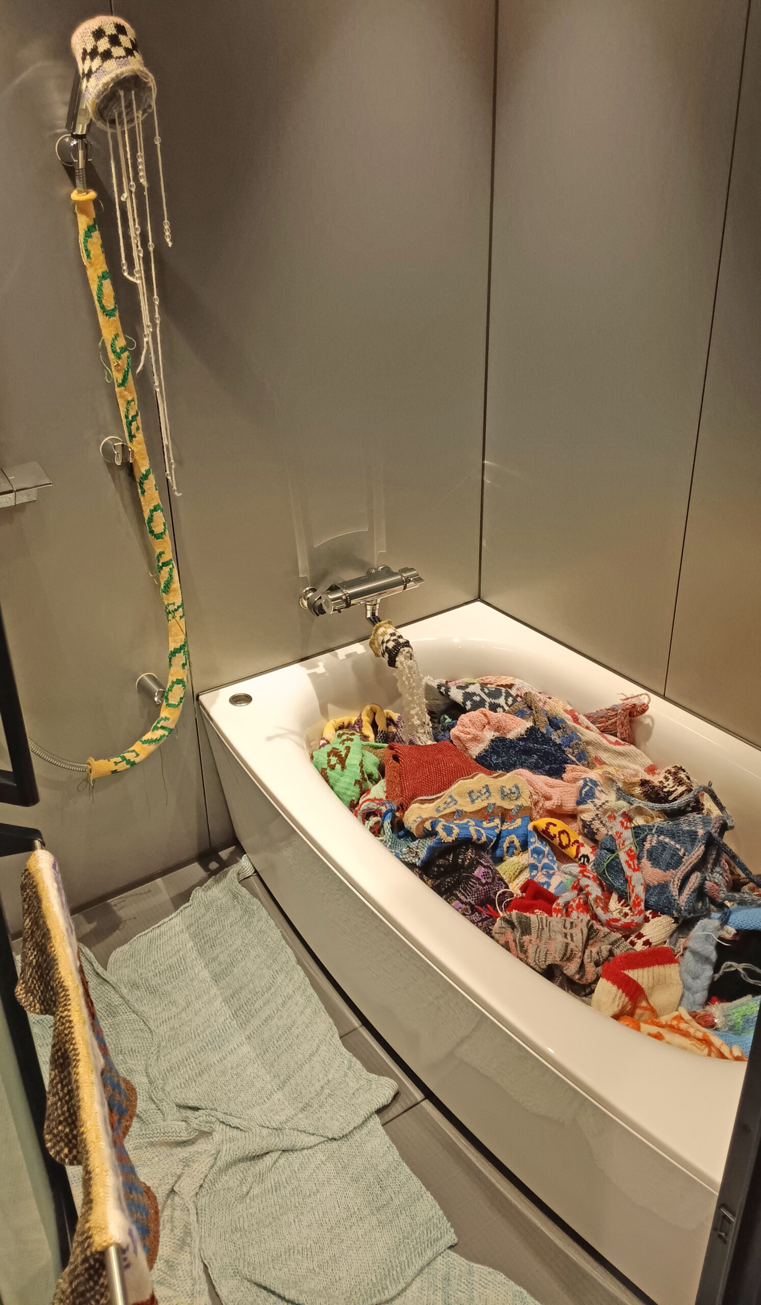 The artist’s works can also be found throughout the hotel, particularly in the lobby, and on elevator buttons. The crux of the exhibit, called “Love it Once More,” is that every part of the design is made from recycled yarn that was about to be discarded.