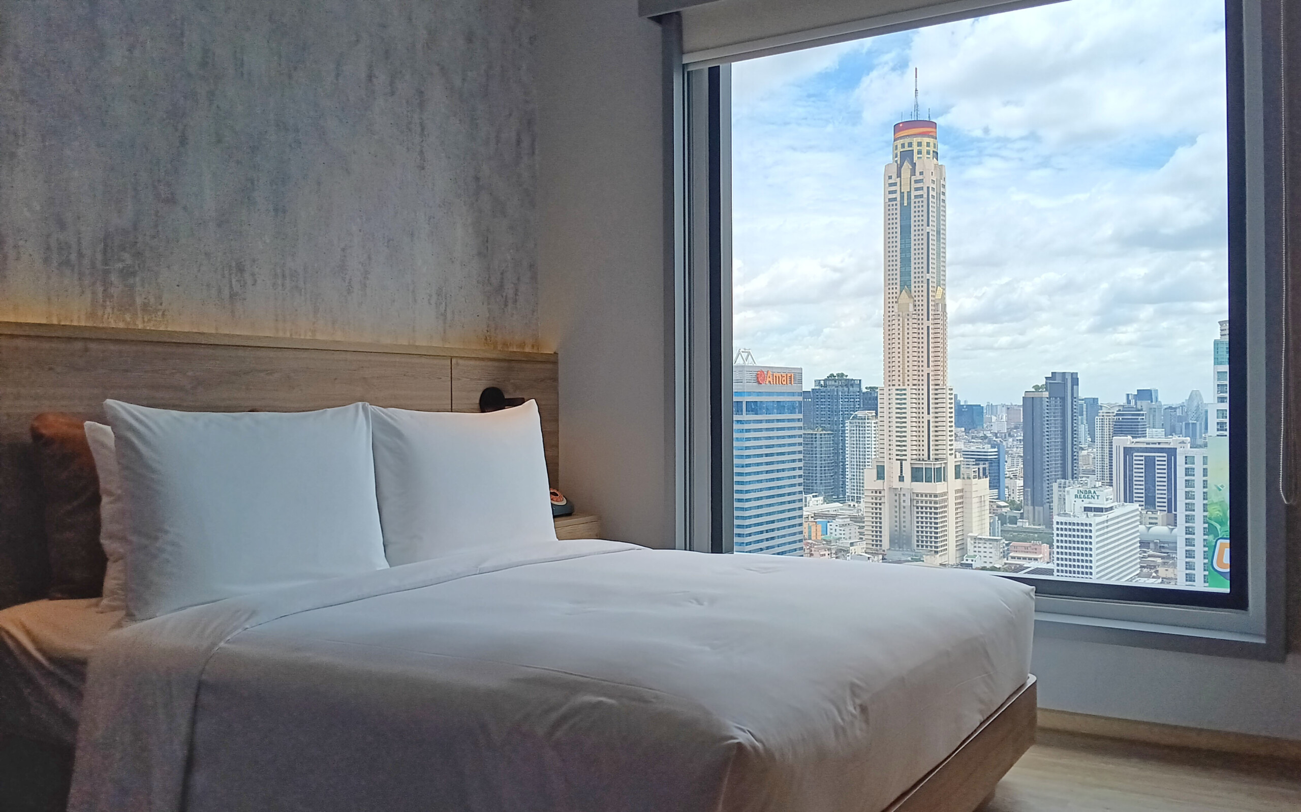 The room was clean and polished looking, had neat views of Pratunam and Baiyoke Sky, and ample places to charge devices.