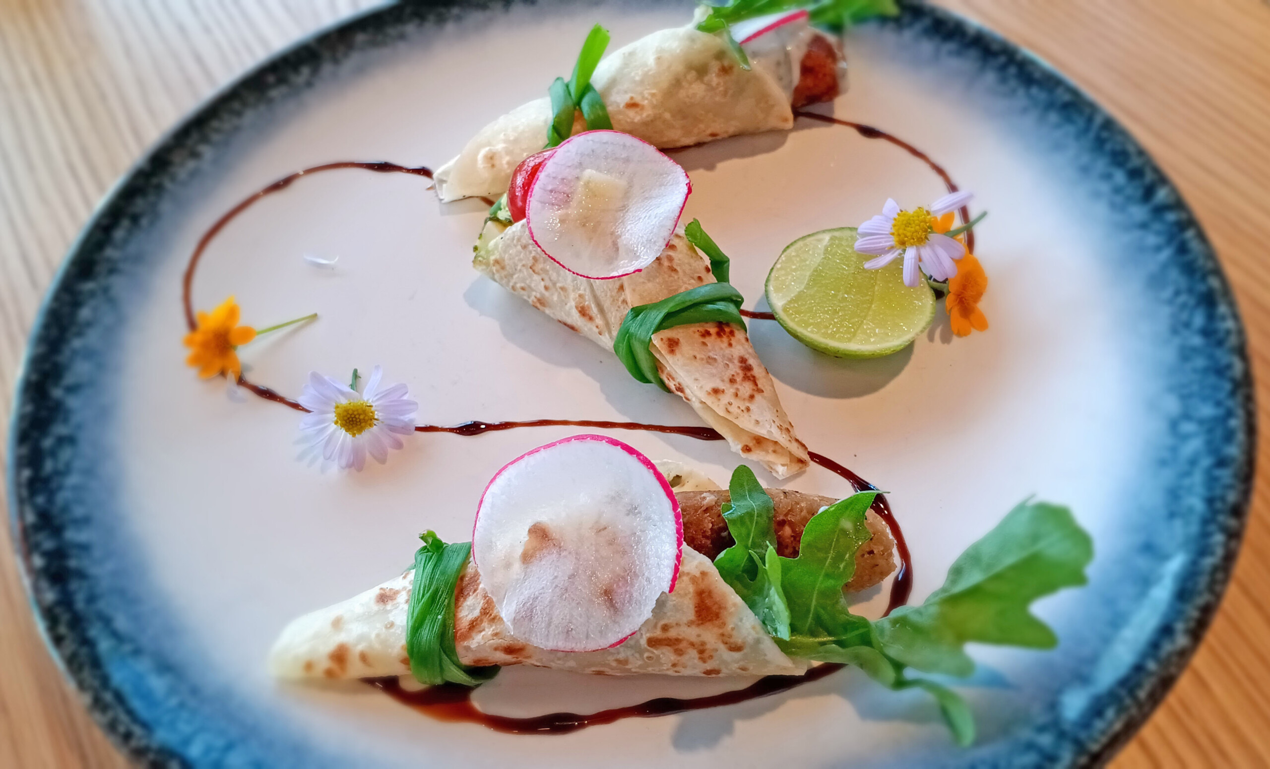 Unfortunately, I accidentally deleted photos of the drinks. There was a good mocktail with grapefruit and lemon, and a cocktail with peach liqueur, and butterfly pea to tint the drink violet. Most interestingly, the latter cocktail was topped with a couple of slices of Bengal currants, drought-tolerant, and popular in ayurvedic medicine.